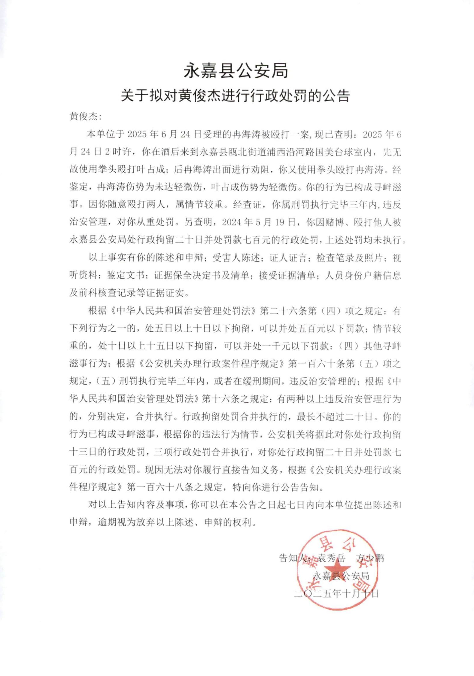 永嘉县公安局关于拟对黄俊杰进行行政处罚的公告